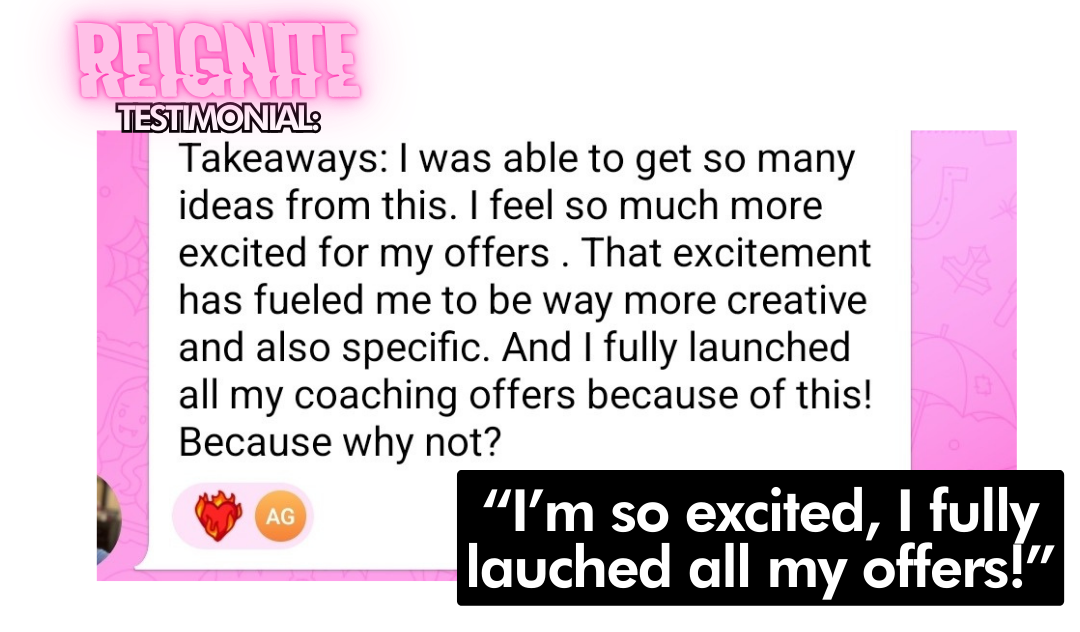 Access an exclusive Telegram channel where you’ll receive instant access to REIGNITE to help you revamp your business for 100% alignment to your unique genius. (access via the app on your device, or via desktop)